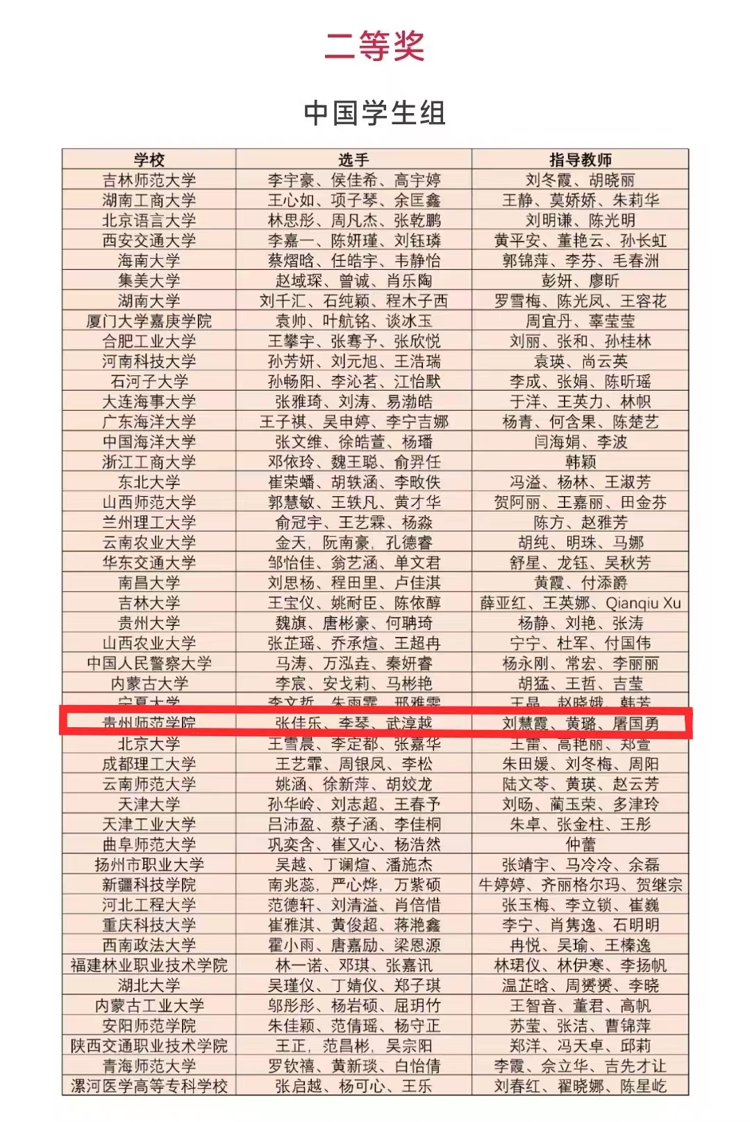 此次全国高校学生跨文化能力大赛,以“坚定文化自信 增进国际理解”为主题,吸引了来自28个省市自治区1000多所高校的3000多名学生参加。前期经校赛、省赛比拼,我校张佳乐、李琴、武淳越三位同学组成的伟德国际1949官网代表队,同贵州大学代表队一道成为首次晋级全国决赛的贵州高校代表队。决赛现场,经过案例开发与展析、名言名句解读、知识问答、情境述评和讲述中国故事等多项比赛环节的考察,最终荣获国奖二等奖。