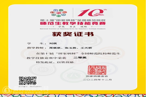 本网讯 2024年11月29日—12月1日,第十届“田家炳杯”全国师范院校师范生教学技能竞赛在浙江师范大学举办。本届大赛共吸引来自全国250所院校的1831名选手参赛,参赛院校与选手数均创历史之最。决赛阶段共有来自155所院校的509名选手到场参赛,经过激烈角逐,马克思主义学院2022级思想政治教育专业刘琪同学最终荣获思想政治教育组二等奖,取得了马克思主义学院思想政治教育专业自参加该项赛事以来的最好成绩。