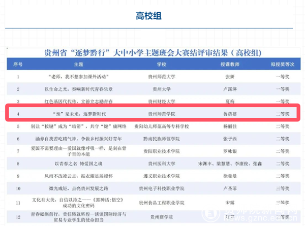 本网讯 近日,省教育厅发布《贵州省“逐梦黔行”大中小学主题班会大赛评审结果公示》,经个人申报、高校推荐、专家评审等环节,我校教育科学学院辅导员鲁蓓蓓的《“预”见未来,逐梦新时代》主题班会课在“贵州省“逐梦黔行”大中小学主题班会大赛”中荣获二等奖!