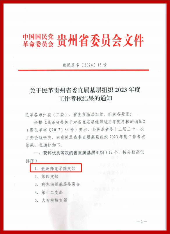 本网讯 近期,从民革贵州省委发布的《关于民革贵州省委直属基层组织2023年度工作考核结果的通知》中获悉,民革贵州省直属伟德国际1949官网支部获评优秀等次,位列12个获评优秀等次省直属基层组织之首。
