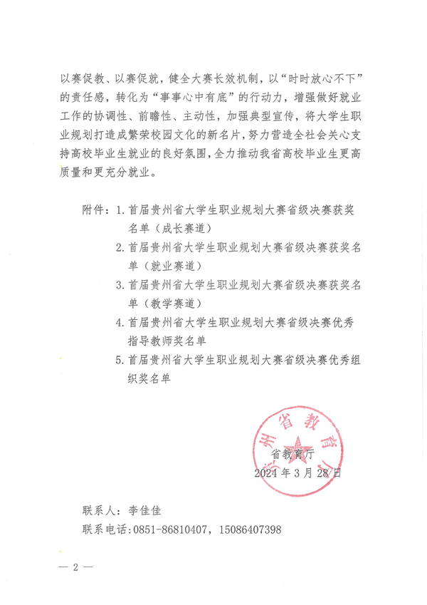 我校始终将就业育人工作置于重要位置。自2023年11月贵州省赛启动以来,我校积极筹备、广泛动员,围绕“以赛促学、以赛促教、以赛促就”目标,精心组织广大学生参加生涯闯关、学院和学校选拔赛。备赛期间,指导教师与选手紧密合作,对作品进行反复打磨与完善,为选手在省赛中取得优异成绩奠定了坚实基础。未来,我校将继续以大赛为契机,深化大学生职业发展与就业指导课程改革建设,持续推进学生职业生涯规划与就业指导工作,让大赛真正成为加强学生职业生涯教育的大课堂、促进人才供需对接的关键平台、服务毕业生就业的大市场,全力以赴推动毕业生更高质量更加充分就业。