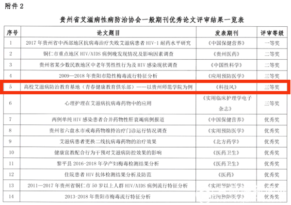 本次论文评审工作是由贵州省防艾协会组织流行病学、卫生统计学、社会学、疾病预防控制、临床诊疗等相关领域专家对参评论文进行评审。我校是所有参评单位中唯一一家高校,论文是以大学生青春健康教育和艾滋病防控教育为研究内容。获奖论文是由学工部综合科官鹏飞(防艾基地(青春健康俱乐部)、校红丝带防艾社团指导教师)撰写的。