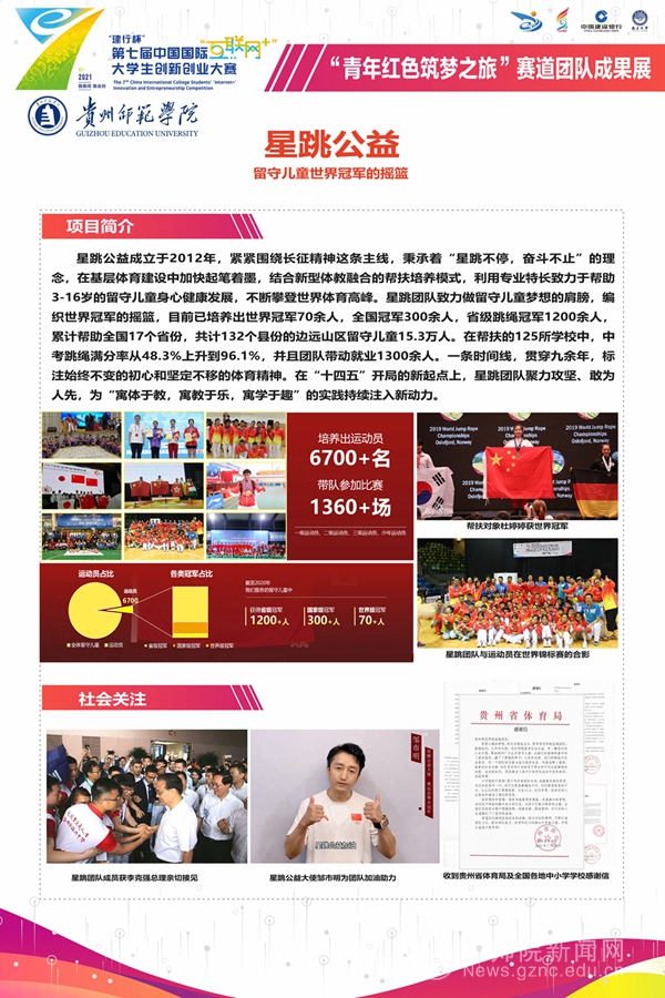 本网讯 10月12日至15日,第七届中国国际“互联网+”大学生创新创业大赛全国总决赛在南昌大学举行,中共中央政治局委员、国务院副总理孙春兰出席冠军争夺赛暨颁奖典礼。我校红旅赛道项目《星跳公益——留守儿童世界冠军的摇篮》荣获本届大赛银奖,红旅赛道项目《牛转黔坤》、主赛道项目《钟灵毓秀》荣获铜的好成绩。