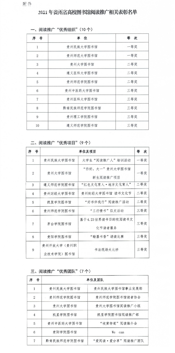 本网讯 为了鼓励在全民阅读工作以及2021年“4.23世界读书日”系列活动中组织得力、成效突出的组织、项目、团队和个人,发挥典型示范带动作用,共同推进全省高校图书馆阅读推广工作,贵州省高等学校图书馆工作指导委员会在近期,组织开展了全省高校图书馆阅读推广评选优表彰工作。