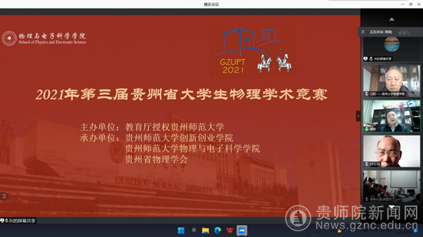 本网讯 中国大学生物理学术竞赛(CUPT)是中国借鉴国际青年物理学家锦标赛(IYPT)的模式创办的国内全国性赛事。该赛事得到了教育部的支持,是实践国家教育中长期发展规划纲要的重要大学生创新竞赛活动之一。目前 CUPT 已经在全国连续举办了十届,以其独特的竞赛模式和理念吸引了越来越多的知名高校和物理精英参与,并已成为国内具有重要影响力的大学生物理竞技赛事之一。为了提高贵州省大学生物理科研和创新能力,经贵州省教育厅批准,并得到贵州省物理学会的支持,特举办贵州省第三届大学生物理学术竞赛。本届大学生物理学术竞赛贵州省省决赛于2021年12月11日在线上成功举行。本次大赛共13所高校130支队伍参加了本届辩论赛,我校代表队在物理与电子科学学院基层党委书记熊德永、副院长陈德良的带队下参加了此次大赛。