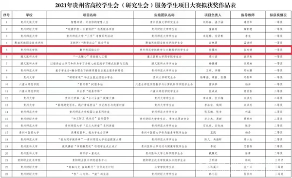 本网讯 近日,由共青团贵州省委、贵州省学生联合会启动的2021年贵州省高校学生会(研究生会)服务学生项目大赛评选结果已公布,数学与大数据学院(以下简称数大学院)获得省级一等奖的优异成绩。