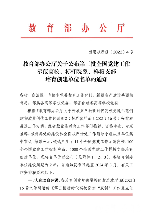 本网讯 近日,教育部公布第三批新时代高校党建示范创建和质量创优工作培育创建单位名单,我校物理与电子科学学院电子系学生党支部入选“全国党建工作样板支部”培育创建单位。自教育部实施新时代高校党建示范创建和质量创优工作以来,我校入选“全国党建工作样板支部”创建单位增至3个。