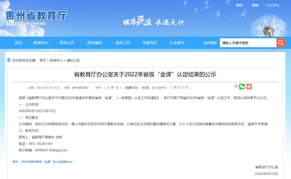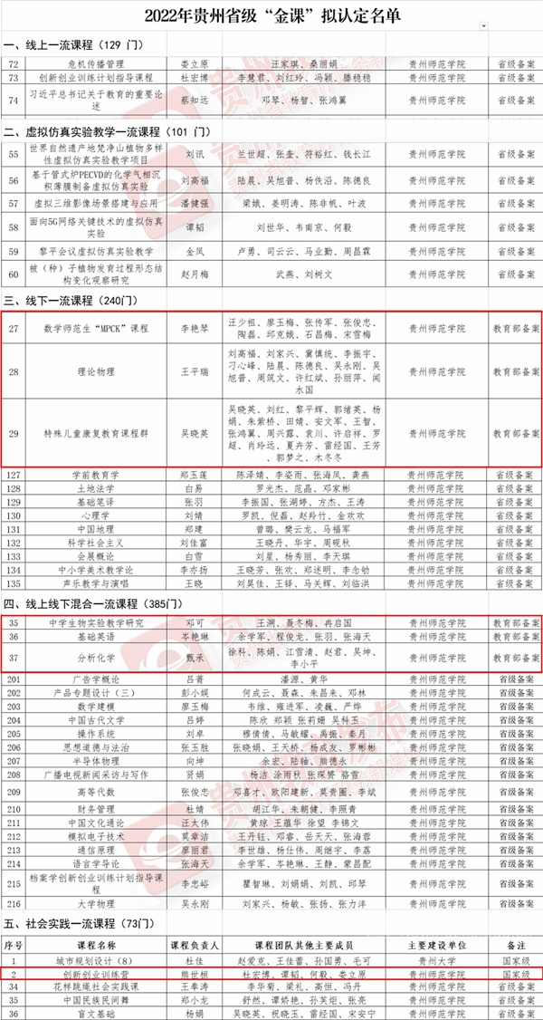 本网讯 8月10日至8月16日,贵州省教育厅对2022年省级“金课”认定结果进行了公示,拟认定全省高校共928门本科课程为省级“金课”。我校44门课程获得认定,其中线上课程3门,线下课程12门,线上线下混合式课程19门,虚拟仿真课程6门,社会实践课程4门。截至目前,我校共有国家级一流课程(创新创业训练营)1门,教育部备案线下一流课程3门和线上线下混合式一流课程3门。