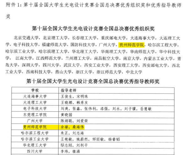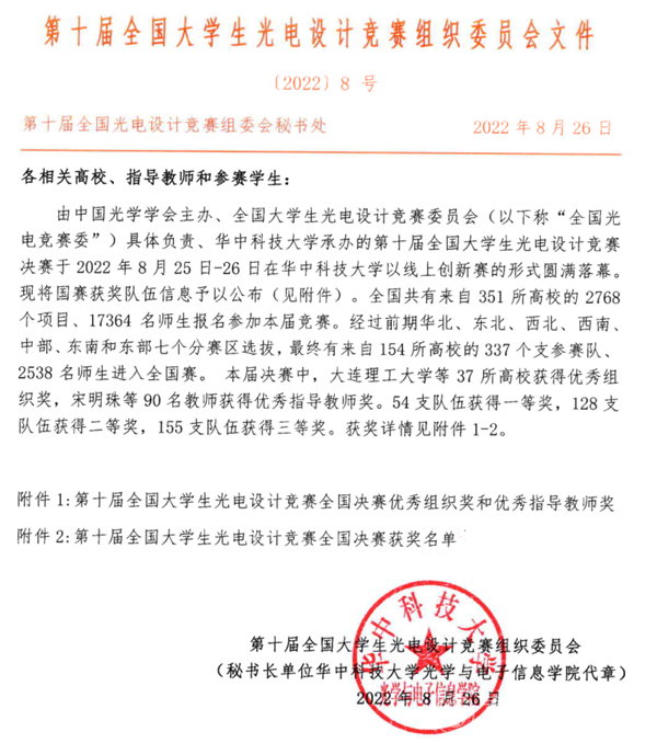 2022年8月25日-26日,第十届全国大学生光电设计竞赛决赛在华中科技大学以线上创新赛的形式圆满落幕。在本次决赛中,我校荣获第十届全国大学生光电设计竞赛全国总决赛优秀组织奖。我校参赛队伍在比赛中积极发扬师院精神和创新精神,努力拼搏,最终获得国赛一等奖1项,国赛二等奖3项,国赛三等奖2项,优秀指导教师奖1项,取得全国大学生光电设计竞赛有史以来的最佳成绩。