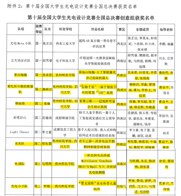 第十届全国大学生光电设计竞赛全国总决赛创意组获奖名单