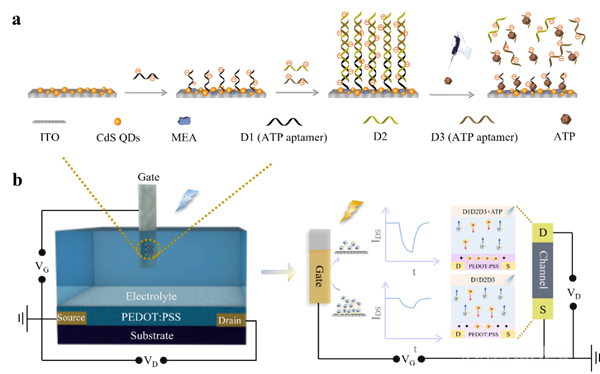 自然界利用分子电荷进行特定的生物反应。针对先进的光电传感器,有机光电化学晶体管(OPECT)利用光取代外部栅极电位的优势,有望成为研究光−生物-物质的新型生物分析通用平台。本项工作展现了表面电荷对OPECT生物传感器的高灵敏调谐,以光敏CdS量子点(QDs)栅电极为例,该电极与具有三磷酸腺苷(ATP)响应的DNA超结构相连接,通过顺序杂交自组装高负电荷的超分子DNA杂交体,经过ATP触发的DNA杂交体解离将导致有效栅极电压的变化,从而将带电分子事件转化为放大的电信号。该工作为未来开发丰富的生物电荷可调谐性OPECT生物传感提供了一种新模式。