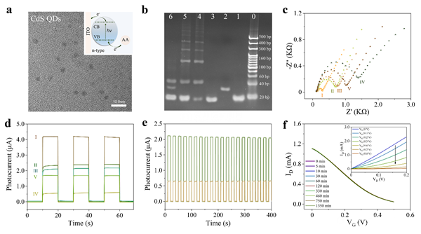 图2.CdS QDs的TEM表征及相关电荷转移机理图;DNA超结构及ATP刺激释放响应过程的凝胶电泳表征;DNA超结构及ATP刺激释放响应过程的电化学阻抗表征;DNA超结构及ATP刺激释放响应过程的光电化学测试表征;ATP刺激释放响应DNA超结构前后的光电流稳定性;OECT器件的稳定性表征。