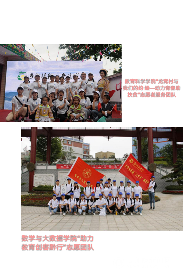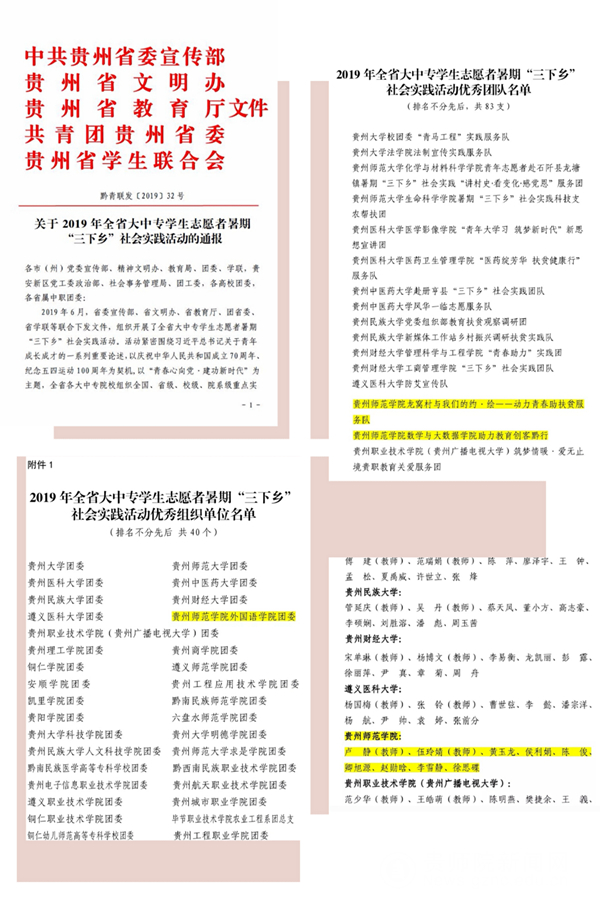 本网讯 为推进“三下乡”社会实践活动持续深入开展,在实践育人中发挥更加突出的作用。日前,省委宣传部、省文明办、省教育厅、团省委、省学联等联合下发《关于2019年全省大中专学生志愿者暑期“三下乡”社会实践活动的通报》文件,对在2019年全省大中专学生志愿者暑期“三下乡”社会实践活动表现突出的团组织、团队和个人进行通报表扬。通过遴选,我校外国语学院团委获评“优秀组织单位”、教育科学学院“龙窝村与我们的约·绘—动力青春助扶贫”志愿者服务团队、数学与大数据学院“助力教育创客黔行”志愿服务队分别荣获“优秀团队”、外国语学院卢静、数大学院伍玲婧两位老师及化材学院黄玉龙、教科院侯利娟、历档学院陈俊、美设学院卿旭源、数大学院赵勋晗、外国语学院李雪静、文传学院徐思碟7位学生荣获“优秀个人”荣誉称号。
