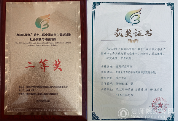 本网讯 2020年8月28日至30日,“赛迪环保杯”第十三届全国大学生节能减排社会实践与科技竞赛在重庆大学举行。由我校化学与材料学院任俊鹏、王毓两位老师指导的参赛作品《表面硅烷化改性新型生物基吸油材料的制备及性能研究》在本次大赛中取得全国二等奖。