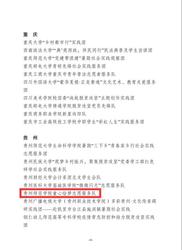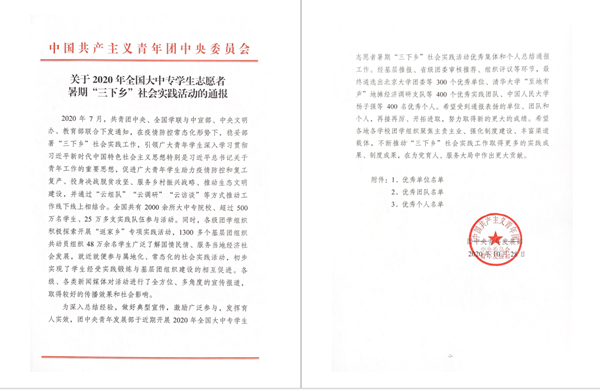 本网讯 近日,团中央青年发展部对在2020年全国大中专学生暑期“三下乡”活动中表现突出的优秀单位、团队与个人进行了总结表彰。我校童心绘梦志愿服务队荣获2020年全国大中专学生志愿者暑期“三下乡”社会实践活动优秀团队。