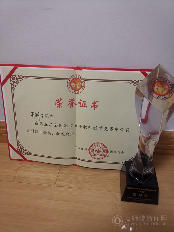 此前,在由省教育厅、省总工会联合举办的第五届全国高校青年教师教学竞赛省级选拔赛中,吴科玉老师就以文科组一等奖第一名的好成绩拔得头筹,随后作为贵州省高校青年教师代表参加全国高校青年教师教学竞赛决赛。学校高度重视本次青年教师教学竞赛,从备赛选拔到打磨课程,从省赛到国赛,在校领导的直接指导下,教务处、校工会、教师工作处和文学与传媒学院高度重视和大力支持。