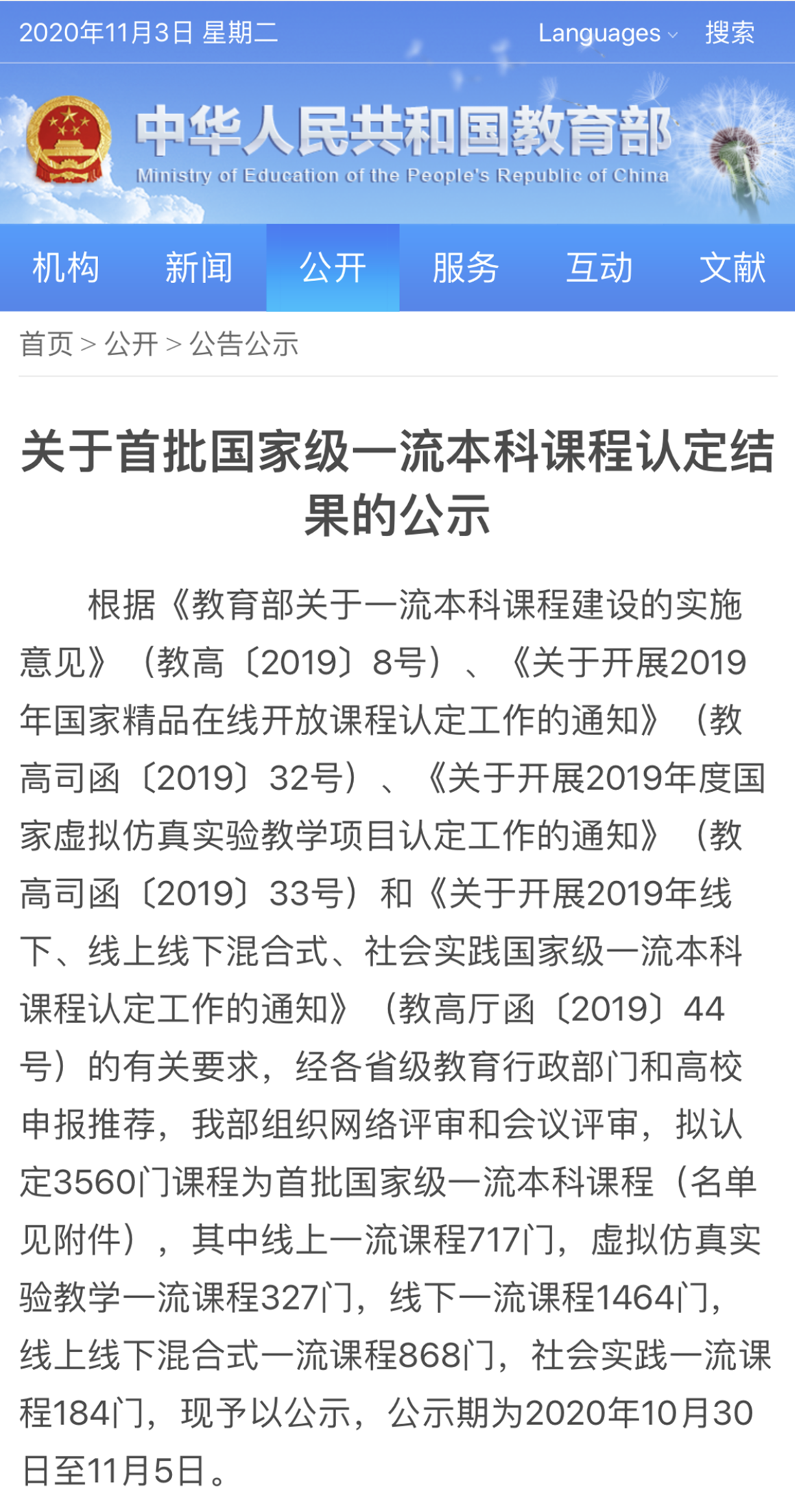 本网讯 近日,首批国家级一流本科课程认定结果公示。经省级教育行政部门和高校申报推荐,教育部组织网络评审和会议评审,拟认定3560门课程为首批国家级一流本科课程,其中线上一流课程717门,虚拟仿真实验教学一流课程327门,线下一流课程1464门,线上线下混合式一流课程868门,社会实践一流课程184门。