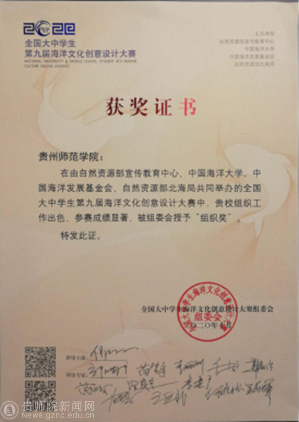 本网讯 全国大中学生海洋文化创意设计大赛大赛组委会在2020年“世界海洋日暨全国海洋宣传日”活动期间暨全国主力抗击疫情期间,以“资源海洋”为主题,举办全国大中学生第九届海洋文化创意设计大赛。我校教师李琴、朱稷源组织大一学生参赛,参赛成绩显著,被组委会授予“组织奖”。