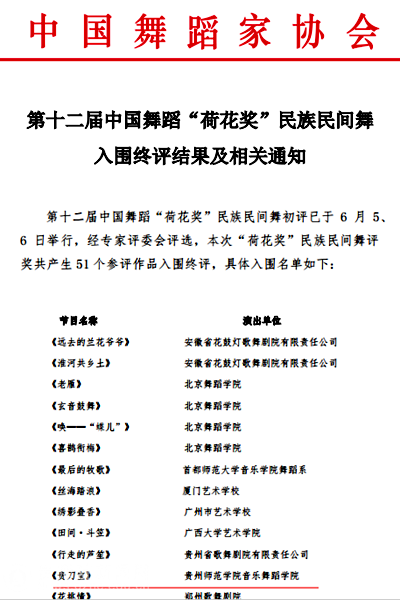 本网讯 近日,由中国文学艺术界联合会、中国舞蹈家协会主办的中国舞蹈“荷花奖”初评比赛在北京举行,我校音乐舞蹈学院选送的作品《贵刀宝》成功进入下一轮比赛。此次活动共收到全国五百多个作品参与评选,经专家评委会层层选拔,共产生51个作品入围决赛。