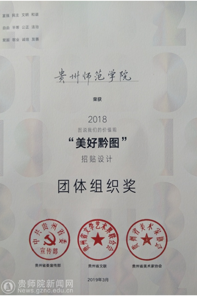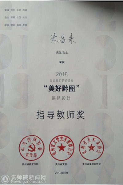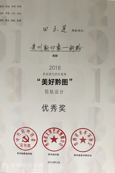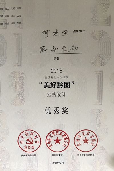 本网讯 近日,由省委宣传部、省文联、省美术家协会组织的第四届“图说我们的价值观·美好黔图”公益广告设计征集活动。美术与设计学院组织了2018级产品设计专业、2016级视觉传达设计班参加。经过专家严格初评与复评,评审出一等奖1名,二等奖2名、三等奖3名,特别奖1名,优秀奖30名,优秀团体组织奖1名,优秀指导教师奖2名。其中,伟德国际1949官网荣获团体组织奖,朱昌来荣获指导教师奖。2016级视觉传达班周定燕同学系列作品《美好黔途》荣获三等奖,何建强同学系列作品《黔知未知》、田玉莲系列作品《贵州新印象》荣获优秀奖;参赛作品表现形式丰富,突出时代性,运用现代艺术手段,增强传播力和感染力,主题鲜明、创意新颖、通俗直观、生动感人。