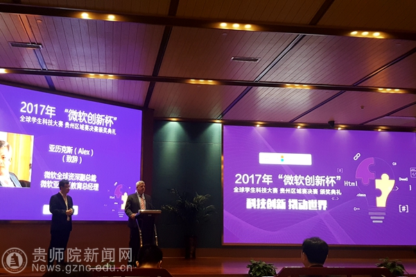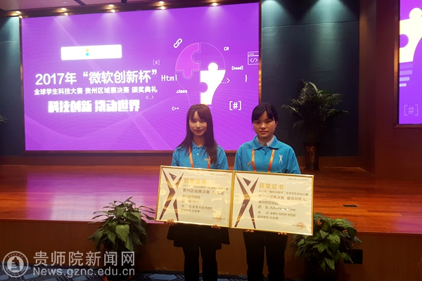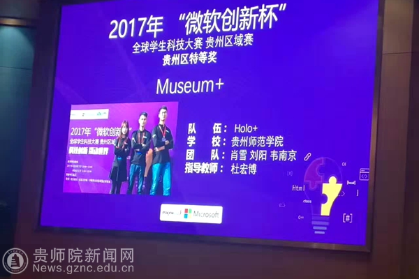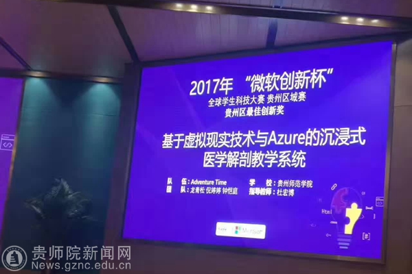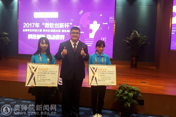 “微软创新杯”全球学生科技大赛,是面向全球大学生的一项创新创业项目设计大赛,2017年是“微软创新杯”第二次在贵州举办,所有高校备受瞩目。我校继上一年的全省特等奖之后再拿该赛桂冠,成绩显赫。最新兴的科技创新理念,在最精诚团结,刻苦奋进,不屈不挠的队伍共同打造之下,“Holo+”团队终于宝剑出锋,一鸣惊人。我院肖雪同学同队友在比赛期间,不眠不休,克服重重困难,不断改良打磨她们项目的方方面面,不断翻译撰写背诵项目答辩稿,不断突破自身耐力与智慧的潜力。人生总要冒险,钟恺庭同学所在的“avventure time”团队同样付出了常人所不能忍耐负荷的努力,他们的“金点子”创意最佳,获此殊荣,实至名归。钟恺庭同学曾在我校各大英文演讲大赛甚至省级英文演讲大赛中以其地道优质的英语口语,打动了无数人。此次比赛,她的全英文陈述答辩更是引起了“微软创新杯”委派贵州赛区的亚历克斯先生极大注意。亚历克斯还表示想要多与我校交流合作,多多培养像钟恺庭和肖雪同学一样的优异学子。