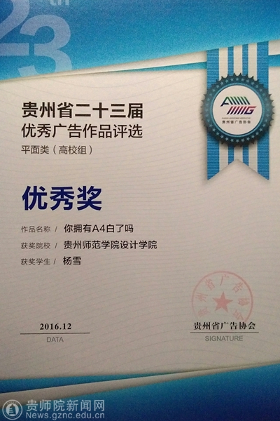 在此次优秀广告大赛评选中我校师生再创佳绩,学校获得优秀组织奖,设计学院教师指导的设计作品《小娱乐、大快乐》(杨东梅)荣获铜奖,设计作品《留住该留住的》(杨雪)、《你拥有A4白吗》(侯小秋)荣获优秀奖,白瑞荣获得“优秀指导教师”奖。