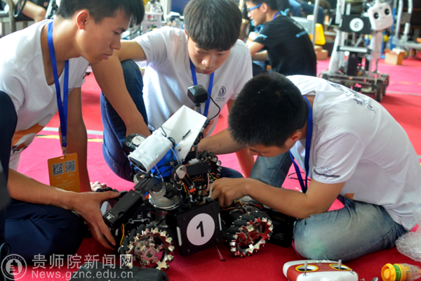 我校队员正在维护机器人