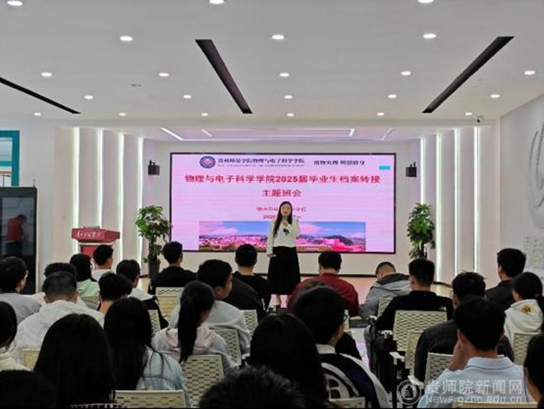 本网讯 为做好2025届毕业生档案转递工作,确保毕业生档案安全、准确、规范转递,5月27日,物理与电子科学学院在大学生事务中心召开2025届毕业生档案转递毕业主题班会。此次班会由2025届毕业班辅导员雷仕娜主讲,学院2025届毕业班60余名学生参加。