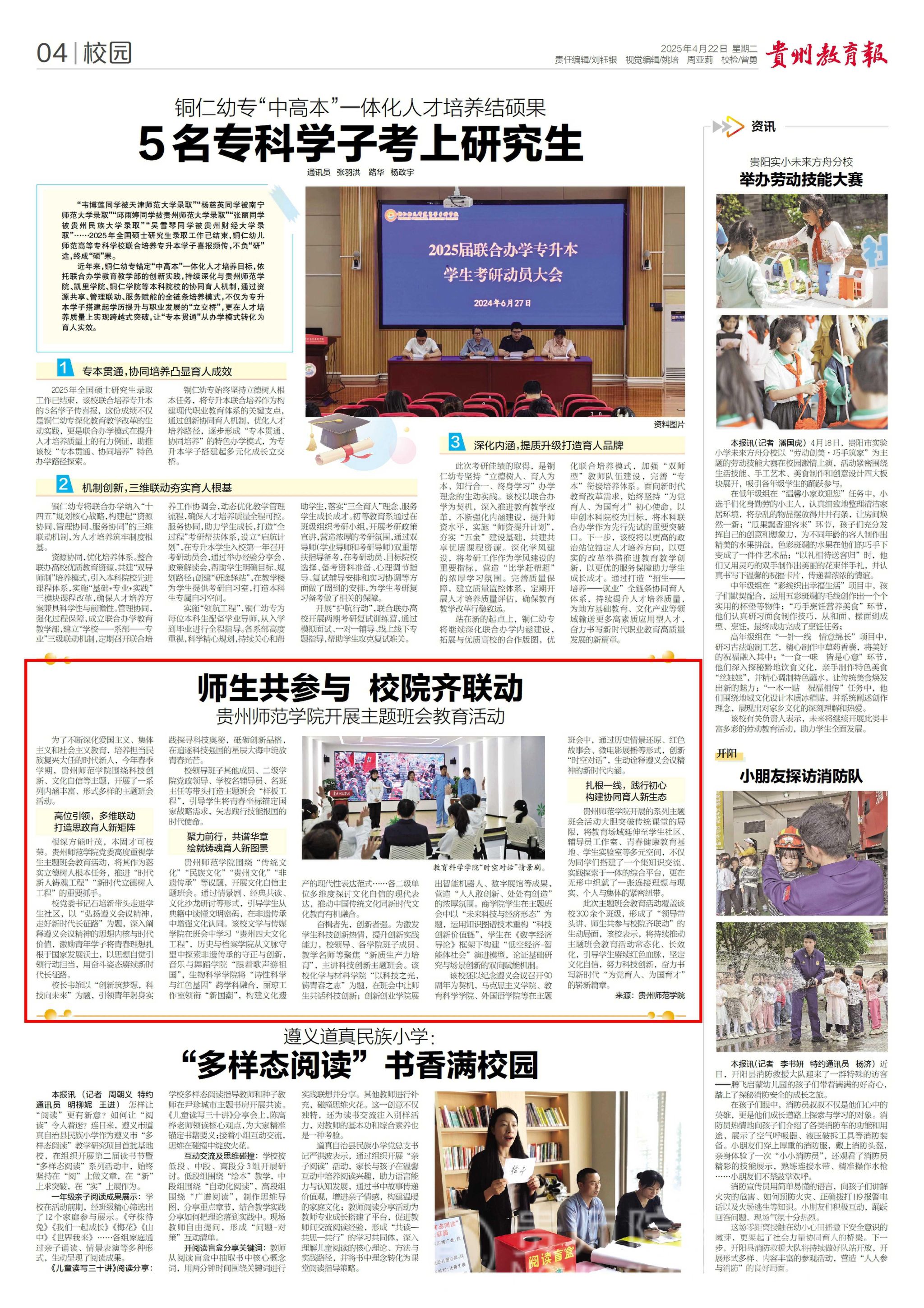 思政力量深度浸润。建立辅导员入驻学生社区机制。一是推进辅导员工作室进社区。国家级名辅导员工作室丽琼工作室、省级名辅导员工作室溯心筑梦工作室、省级名班主任工作室“师创青年”工作室均建在学生社区。二是建立专(兼)职辅导员进公寓制度和社区值班制度,有效实现辅导员与学生同场域、同频率、同成长。三是将主题党日、主题团日、主题班会等教育活动下沉社区。2023年,学校“朝气蓬勃新时代”辅导员主题班会公开课系列活动持续在社区开展;2024年,学校“青春五月 团旗高扬”主题团日活动深入学生社区;2025年,校领导班子领衔在社区开展“纪念遵义会议90周年”+文化自信+科技创新主题班会。四是创新推进思政教师、青年学生理论宣讲队伍深入社区,将党的二十大和二十届三中全会精神、习近平总书记在贵州考察时的重要讲话精神宣讲下沉社区,推动“大思政课”在社区深耕。